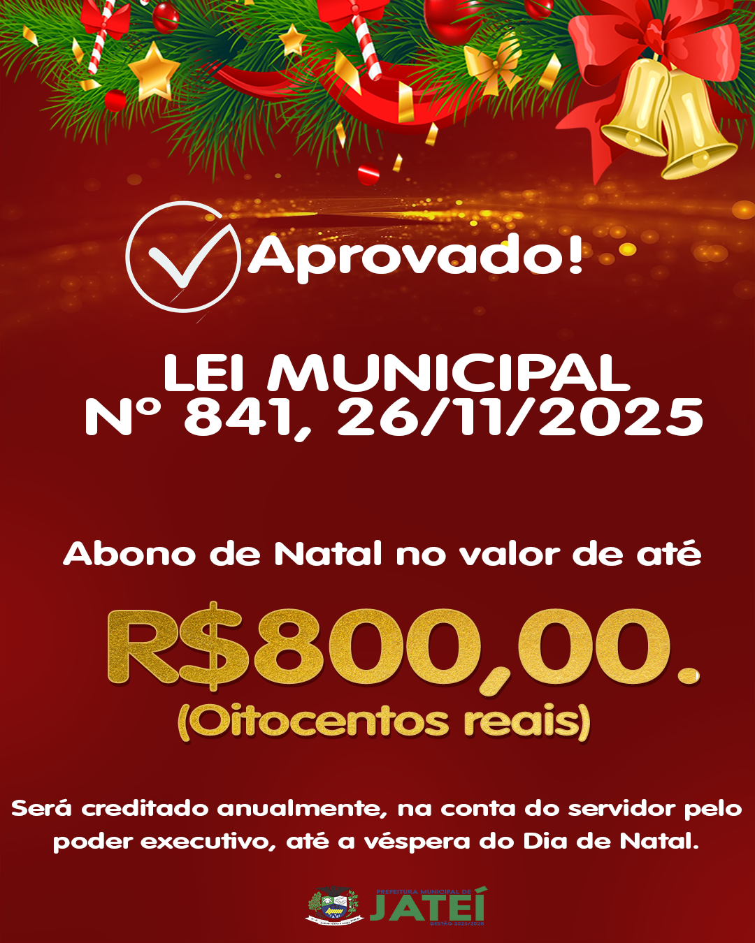 Abono Natalino será concedido em parcela única de até R$ 800,00[...]